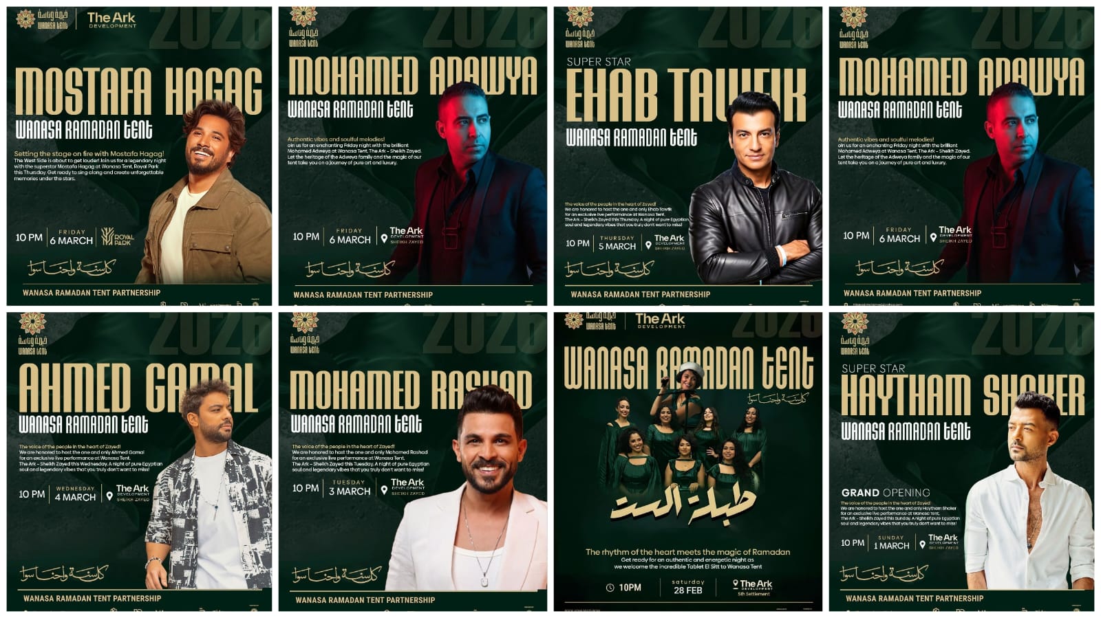 وفي السياق نفسه، كشفت إدارة الخيمة عن جدول حفلات يومي حافل بالنجوم في خيمة وناسة «ذا أرك» بالشيخ زايد وصلة دهشور، حيث تنطلق الفعاليات غدًا الأحد بحفل للنجم هيثم شاكر، ويليه يوم الاثنين حفل للنجم أحمد شيبة، ويوم الثلاثاء مع النجم محمد رشاد، ويوم الأربعاء مع النجم أحمد جمال، ثم الخميس مع النجم الكبير إيهاب توفيق في أولى حفلاته خلال شهر رمضان، على أن يختتم الأسبوع يوم الجمعة بحفل للنجم الكبير محمد عدوية.