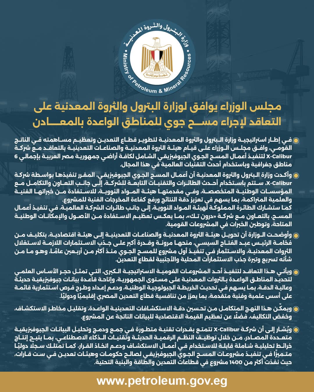 في إطار استراتيجية وزارة البترول والثروة المعدنية لتطوير قطاع التعدين وتعظيم مساهمته في الناتج القومي، وافق مجلس الوزراء على قيام هيئة الثروة المعدنية والصناعات التعدينية بالتعاقد مع شركة X-Calibur لتنفيذ أعمال المسح الجوي الجيوفيزيقي الشامل لكافة أراضي جمهورية مصر العربية بإجمالي 6 مناطق جغرافية وباستخدام أحدث التقنيات العالمية في هذا المجال.