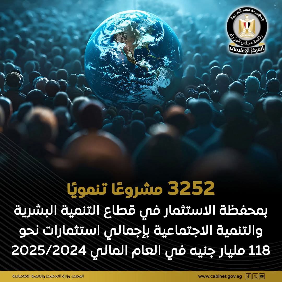 حيث بلغت الاستثمارات العامة في خطة العام المالي 2025/2024 نحو 1.65 تريليون جنيه، وجرى توجيه نحو 42% منها لقطاعات التنمية البشرية مثل التعليم والصحة والحماية الاجتماعية، مع استهداف رفع هذه النسبة إلى نحو 45% في خطة 2026/2025. وفي هذا السياق، تضم محفظة الاستثمار في قطاع التنمية البشرية والتنمية الاجتماعية نحو 3252 مشروعًا تنمويًا بإجمالي استثمارات تُقدَّر بنحو 118 مليار جنيه في خطة 2025/2024، مقارنة بنحو 29.3 مليار جنيه في عام 2016/2015، وهو ما يعكس التوسع في الاستثمارات الموجهة لدعم الخدمات الأساسية وتعزيز شبكات الحماية الاجتماعية، إلى جانب استمرار تنفيذ مشروعات المبادرة الرئاسية «حياة كريمة» لتطوير نحو 4500 قرية يستفيد منها أكثر من 58 مليون مواطن.