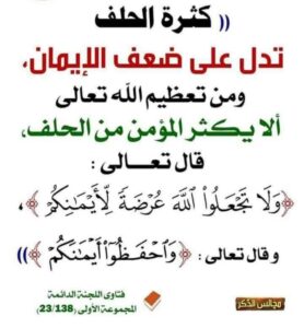 “كثرة الحلف بالله، حتى لو كان صادقًا، هي أمر مكروه شرعًا ومنهي عنه، لقوله تعالى: {وَاحْفَظُوا أَيْمَانَكُمْ} [المائدة:89]، وقوله {وَلَا تُطِعْ كُلَّ حَلَّافٍ مَهِينٍ} [القلم:10]. الإكثار من اليمين يعتبر استهانة بمقام الألوهية، وقد يجر إلى الكذب أو الحلف الكاذب، لذا يجب تعظيم الله وعدم جعل أسمائه وسيلة دارجة في الحديث”
