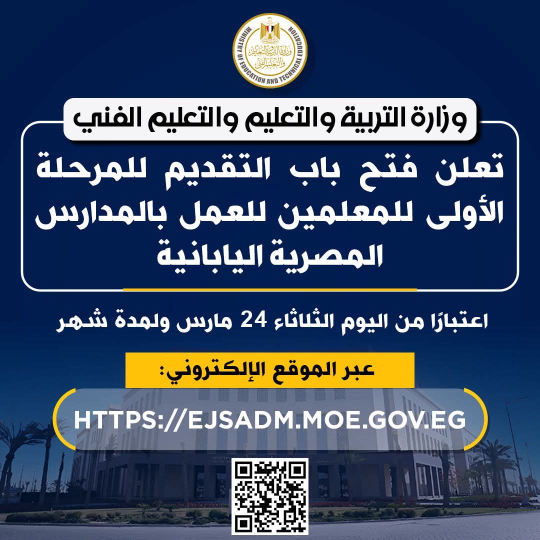 في إطار توجيهات القيادة السياسية بمواصلة التوسع في المدارس المصرية اليابانية، وفي ضوء النجاحات المتواصلة التي تحققها هذه المدارس والإقبال المتزايد عليها، تعلن وزارة التربية والتعليم والتعليم الفني فتح باب التقديم للمرحلة الأولى للمعلمين الراغبين في الانضمام للعمل بالمدارس المصرية اليابانية، وذلك اعتبارًا من اليوم الثلاثاء 24 مارس ولمدة شهر، عبر الموقع الإلكتروني: