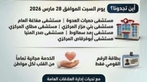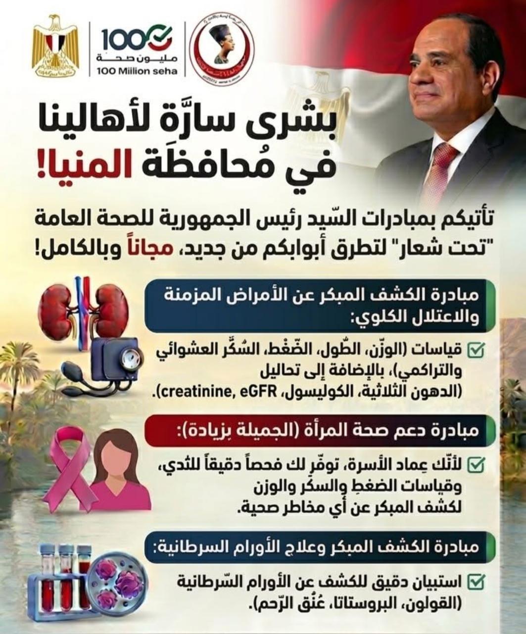 من جانبه، أوضح الدكتور محمود عمر عبدالوهاب، وكيل وزارة الصحة بالمنيا، أن المبادرات تشمل الكشف عن الأمراض المزمنة والاعتلال الكلوي، ودعم صحة المرأة، والكشف المبكر عن الأورام السرطانية، من خلال فرق طبية مدربة وتجهيزات متكاملة، مشيرًا إلى أن الخدمة متاحة بالمجان مع الاكتفاء بإحضار بطاقة الرقم القومي، وذلك بمستشفيات (حميات العدوة – مغاغة العام – بني مزار المركزي – مطاي المركزي – رمد سمالوط – صدر المنيا – أبوقرقاص المركزي).