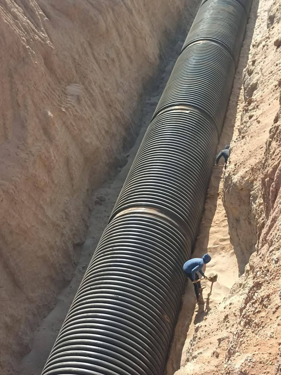 بنسبة التنفيذ والتي وصلت إلى 83%، مع الالتزام الكامل بالجداول الزمنية بنية تحتية عملاقة ، من خلال بمد شبكات بطول 20 كم، وبأقطار ضخمة تصل إلى 2700 مم، تكنولوجيا الجيل الرابع: نستخدم مادة البولي إيثيلين المعرج (CHDPE) لضمان أعلى معايير الجودة والاستدامة.
