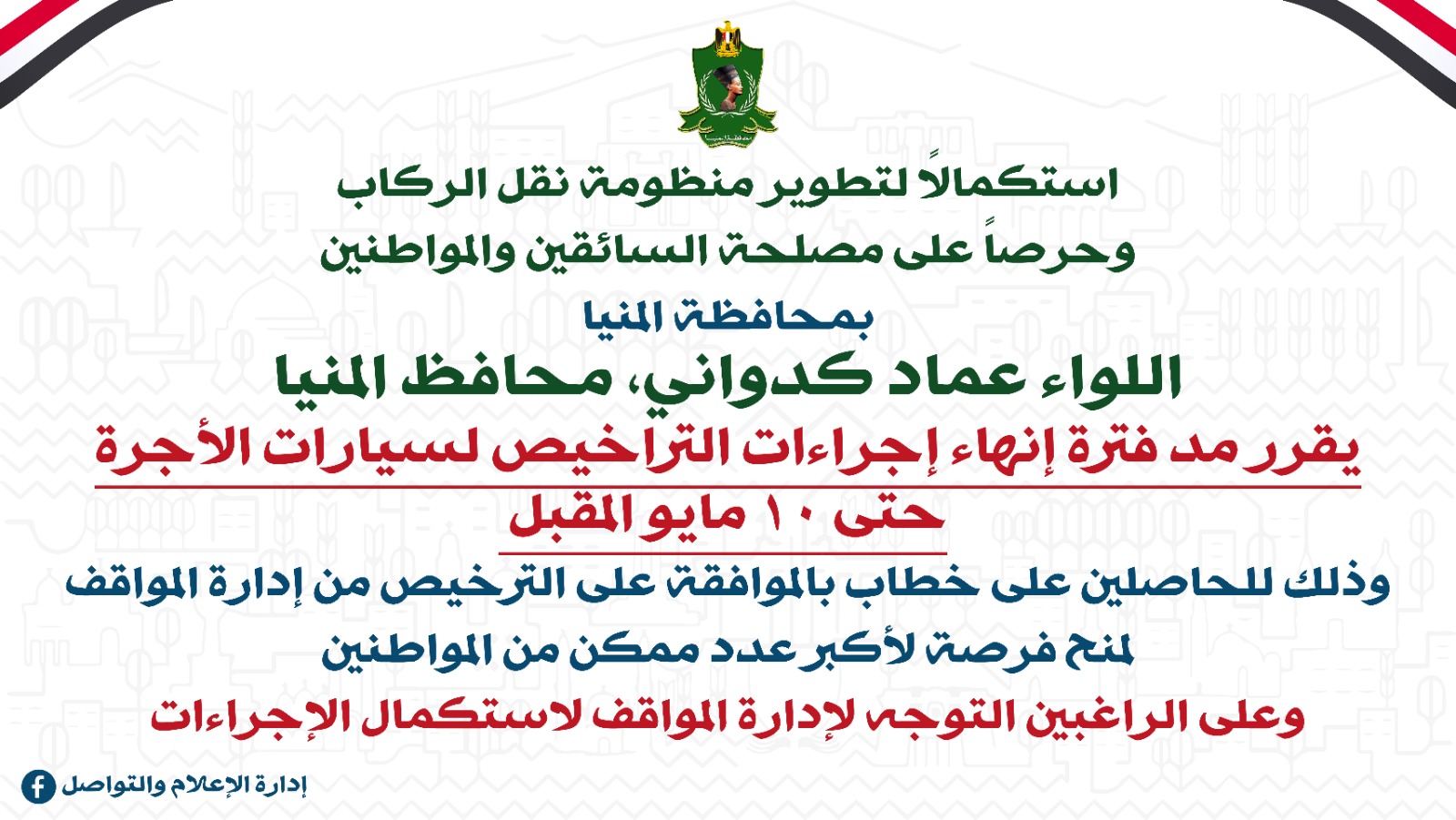 أكد اللواء عماد كدواني، محافظ المنيا، مد فترة إنهاء إجراءات التراخيص لمدة شهر إضافي حتى 10 مايو المقبل، وذلك للحاصلين على خطاب بالموافقة على الترخيص من إدارة المواقف واستجابةً لتزايد الإقبال من أصحاب السيارات الراغبين في الانضمام إلى منظومة نقل الركاب الحديثة، استكمالاً لجهود المحافظة نحو توفير منظومة نقل آمنة وآدمية للمواطنين.