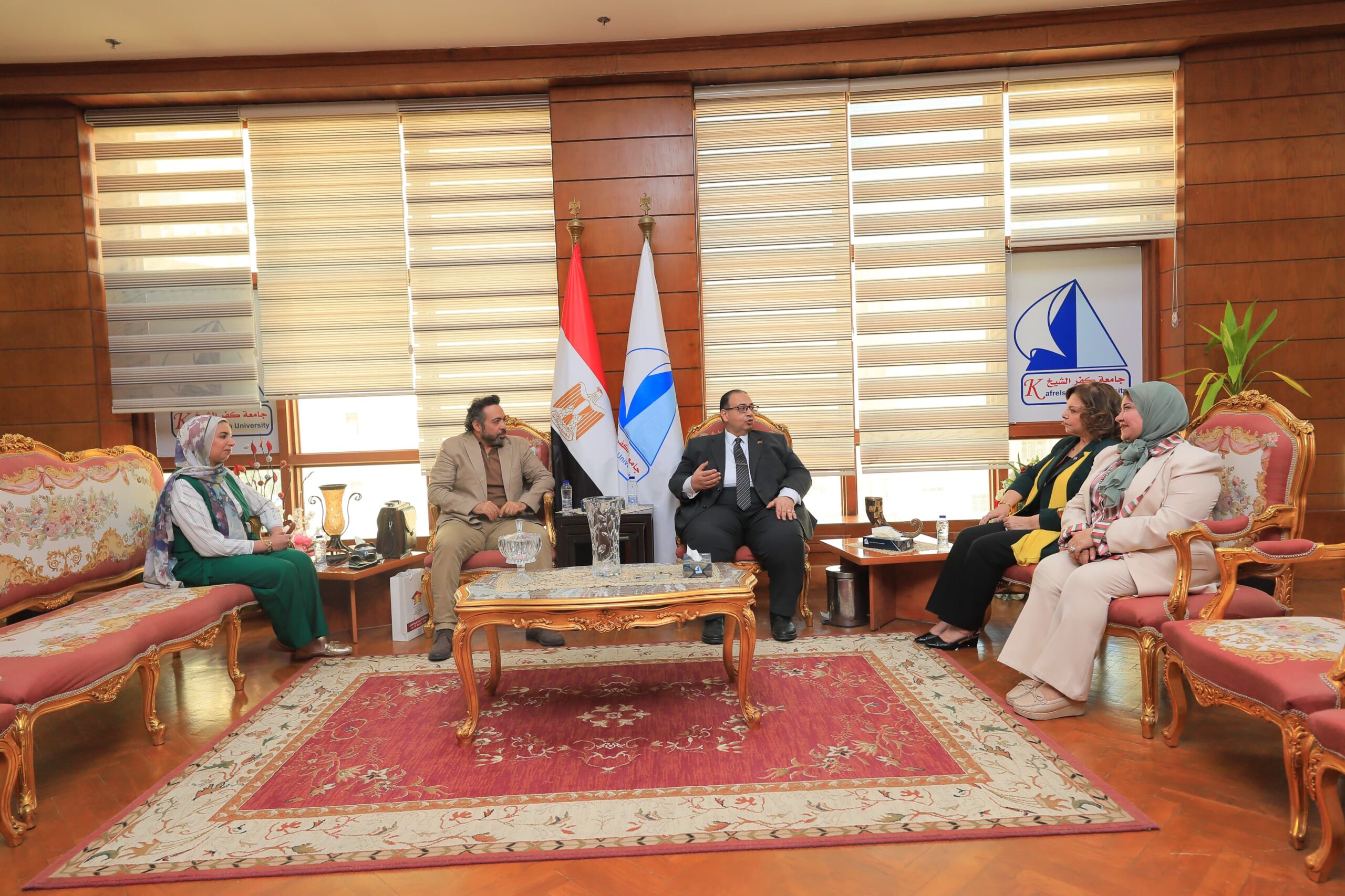 رئيس جامعة كفر الشيخ يستقبل رئيس ملتقى القاهرة الدولي للمسرح الجامعي والفنانة عزة لبيب ويؤكد دعم مصر لفنون الشباب