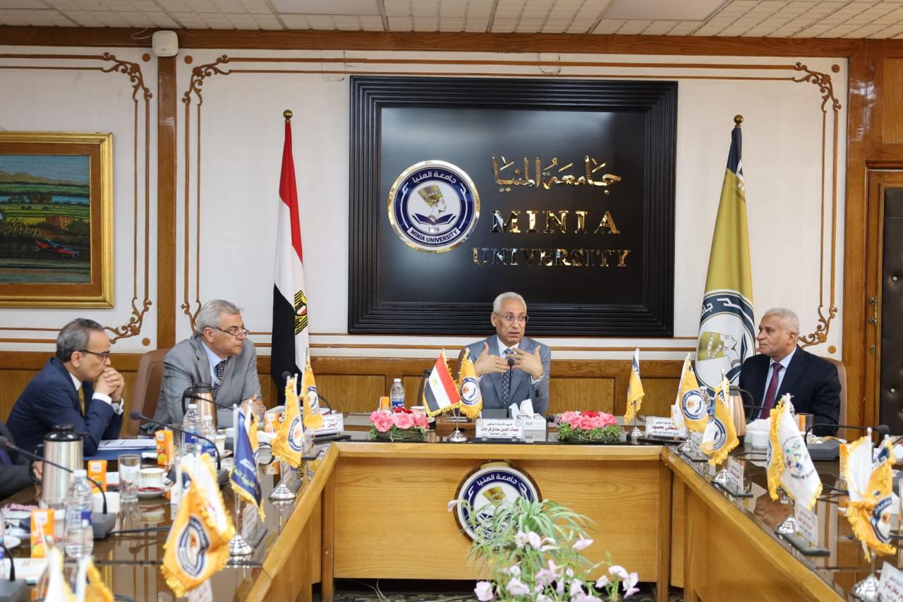 عقد مجلس جامعة المنيا اجتماعه الدوري برئاسة الدكتور عصام الدين صادق فرحات، رئيس الجامعة، لمناقشة عدد من الملفات الحيوية واتخاذ قرارات تنظيمية واستراتيجية تدعم مسارات التطوير المؤسسي الشامل، في إطار حرص الجامعة على مواصلة مسيرتها التنموية وتعزيز مكانتها الأكاديمية والبحثية والمجتمعية، وذلك بحضور نواب رئيس الجامعة: الدكتور أيمن حسنين نائب رئيس الجامعة لشئون خدمة المجتمع وتنمية البيئة، والدكتور مصطفى محمود نائب رئيس الجامعة لشئون التعليم والطلاب، والدكتور حسام شوقي نائب رئيس الجامعة لشئون الدراسات العليا والبحوث، وعمداء الكليات، ومدير مركز ضمان الجودة والاعتماد، والمدير التنفيذي للمعلومات، والمستشار القانوني، وأمين عام الجامعة.