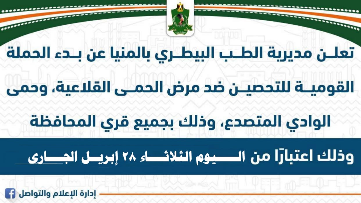 أعلن اللواء عماد كدواني، محافظ المنيا، انطلاق الحملة القومية لتحصين الماشية ضد الحمى القلاعية، اليوم الثلاثاء الموافق 28 أبريل الجاري، من خلال 9 إدارات بيطرية و110 لجان فرعية موزعة على جميع مراكز المحافظة والقرى التابعة لها، بهدف الحفاظ على الثروة الحيوانية.