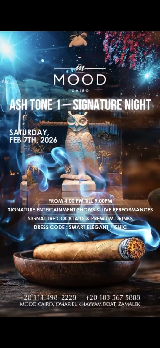 بالاشتراك مع نادي السيجار المصري الأستاذ عبد الرحمن الجميل،وذلك ليلة السبت في السابع من فبراير ٢٠٢٦،من الساعة الرابعة بعد الظهر حتى التاسعة مساءًا في مود روف توب الزمالك السرايا،بحضور دبلوماسي ذات طابع دولي ومحلي بالإضافة الى سيدات ورجال أعمال بعدة مجالات سياسية اعلامية وثقافية.