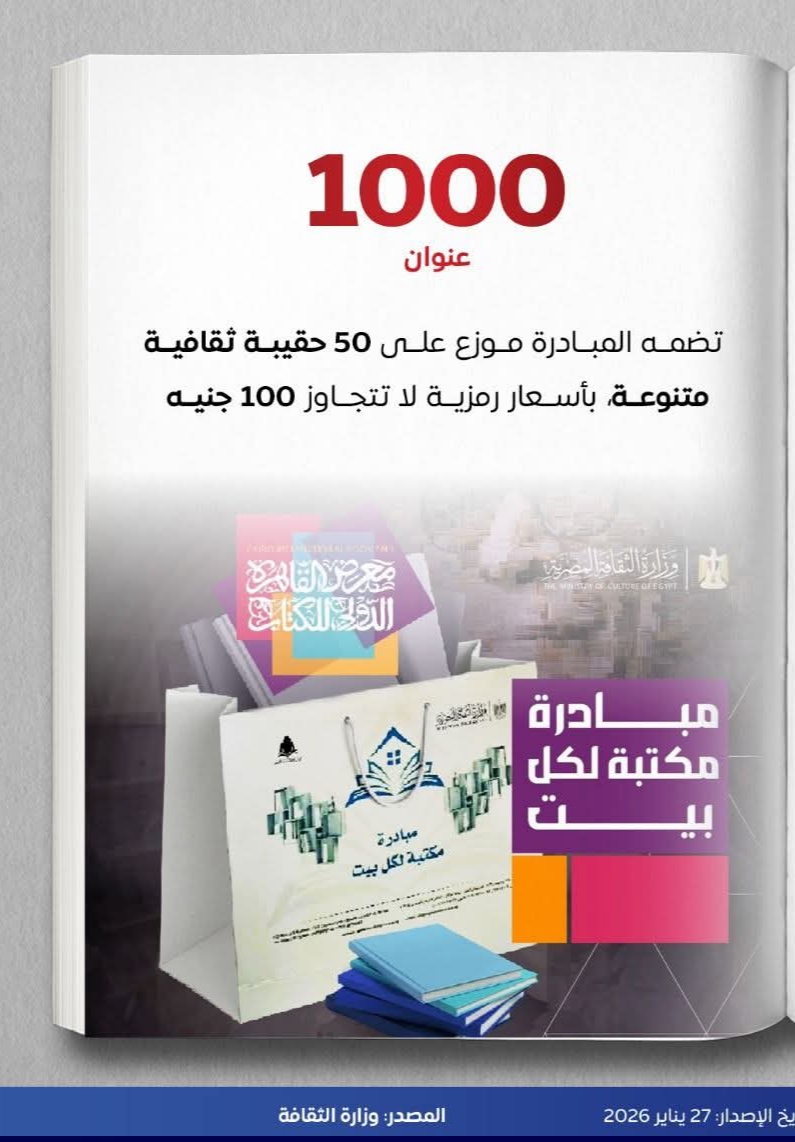 توفر المبادرة «حقيبة ثقافية» تحتوي على 20 كتابًا بسعر لا يتجاوز 100 جنيه، ويتم عرضها داخل الجناح المخفّض للهيئة العامة للكتاب.