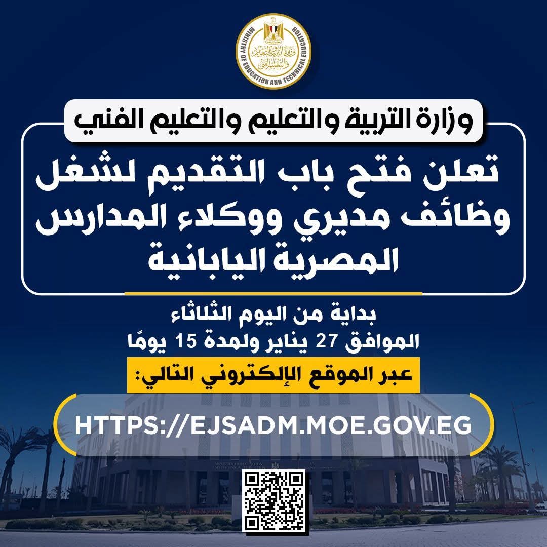 وتؤكد الوزارة أن التقديم لوظائف مدير مدرسة ووكيل مدرسة يستهدف استقطاب قيادات تربوية مؤهلة تمتلك الخبرة والكفاءة الإدارية، والقدرة على قيادة بيئة تعليمية حديثة تدعم الابتكار وتحقق مستهدفات نموذج المدارس المصرية اليابانية.