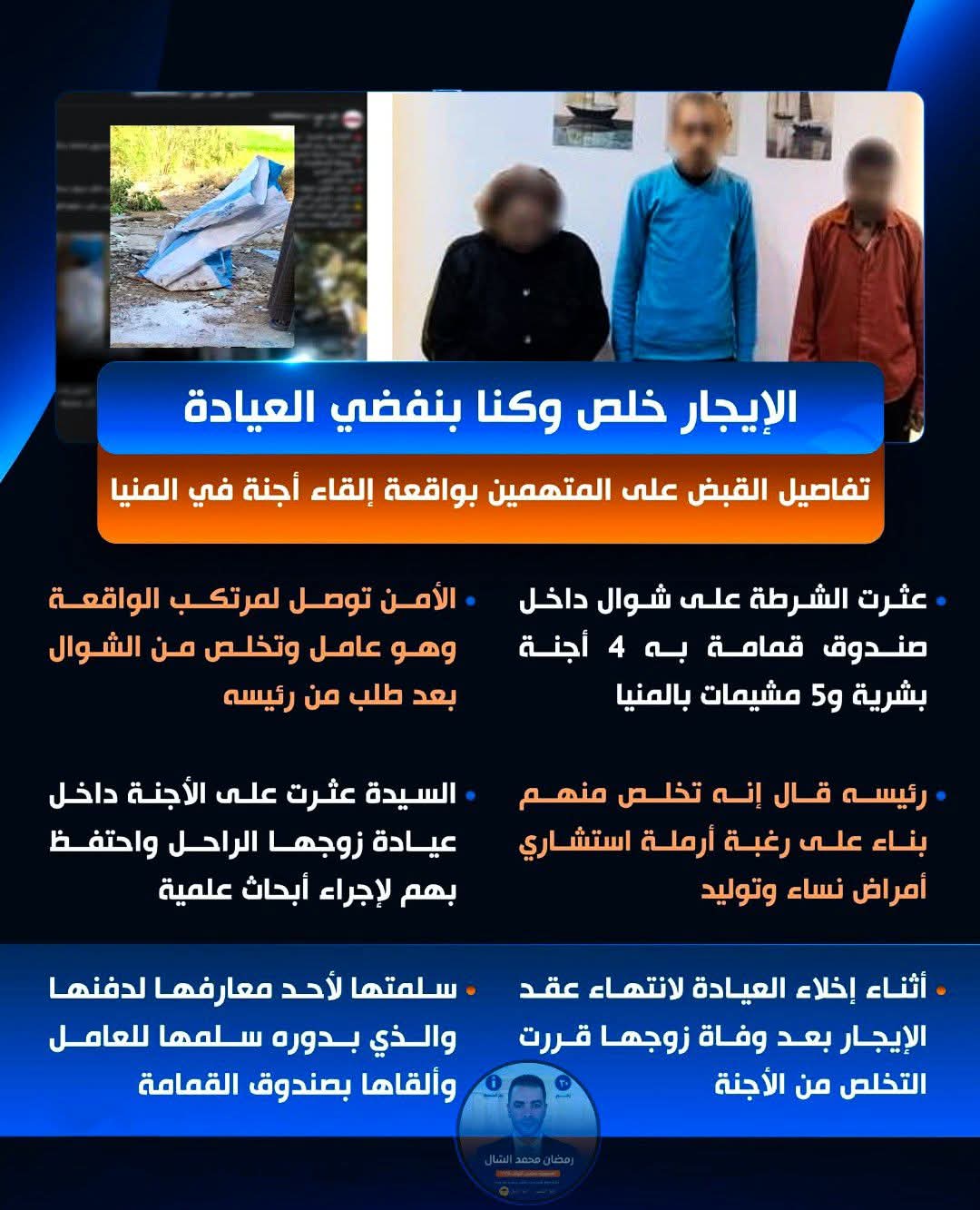 تعود تفاصيل قضية أجنة المنيا إلى تلقي الأجهزة الأمنية إخطارًا من غرفة عمليات النجدة يفيد بعثور أحد الأهالي على جوال داخل صندوق قمامة بمنطقة كدوان، وبفحص محتوياته تبين وجود 9 أجنة بداخله، ما أثار حالة من الصدمة بين المواطنين.