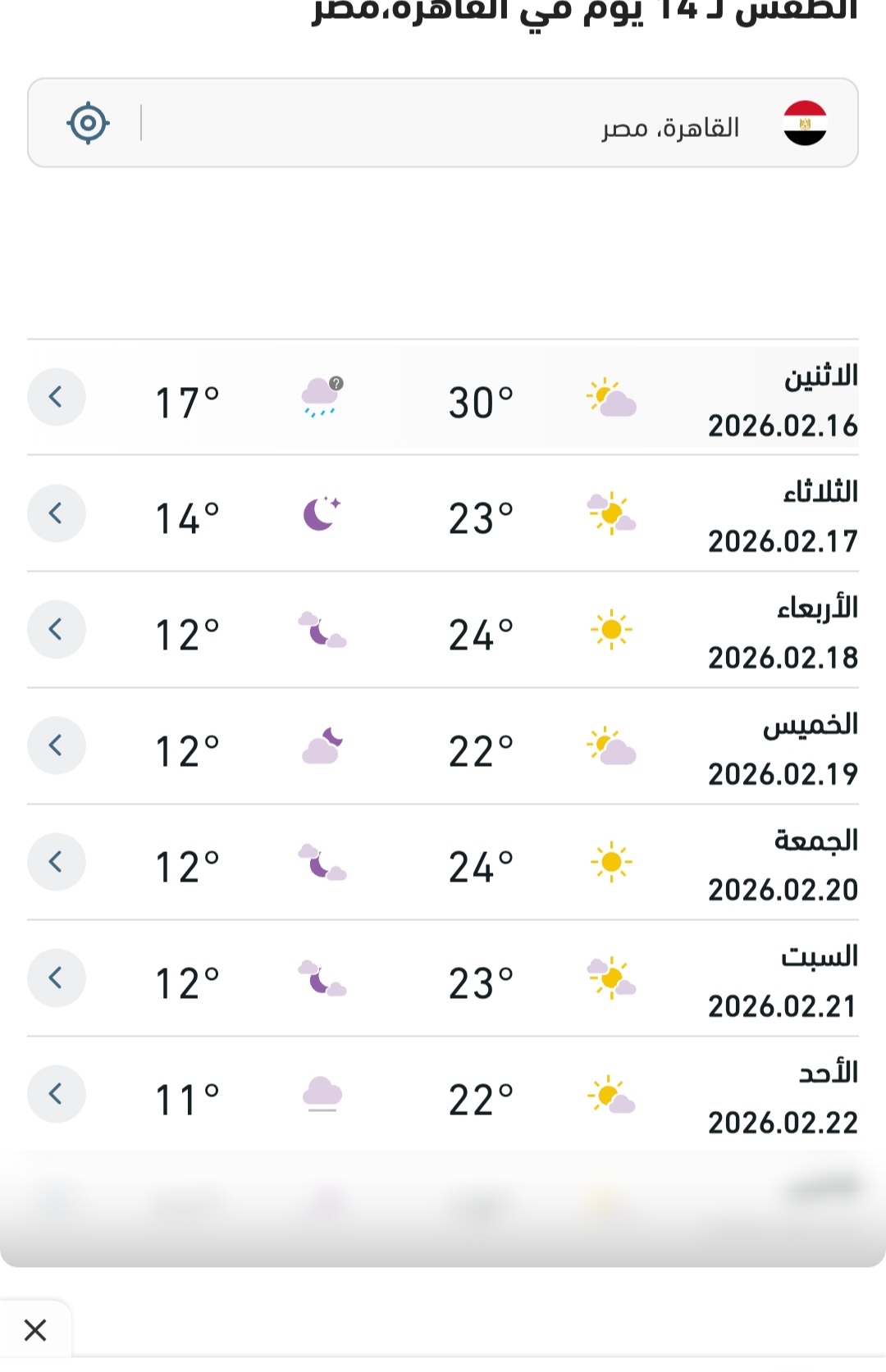 أعلنت الهيئة العامة للأرصاد الجوية عن توقعاتها لحالة الطقس غداً الثلاثاء 17 فبراير 2026، حيث تشهد العاصمة القاهرة انخفاضاً ملحوظاً في درجات الحرارة مقارنة باليوم، ليسود طقس دافئ نهاراً وبارد ليلاً.