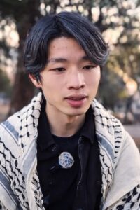 وتُظهر صورته المنتشرة وهو يرتدي (الكوفية) تعبيراً عن تضامنه الكامل مع القضية، ورفضه لما يصفه بـ (القهر والظلم).