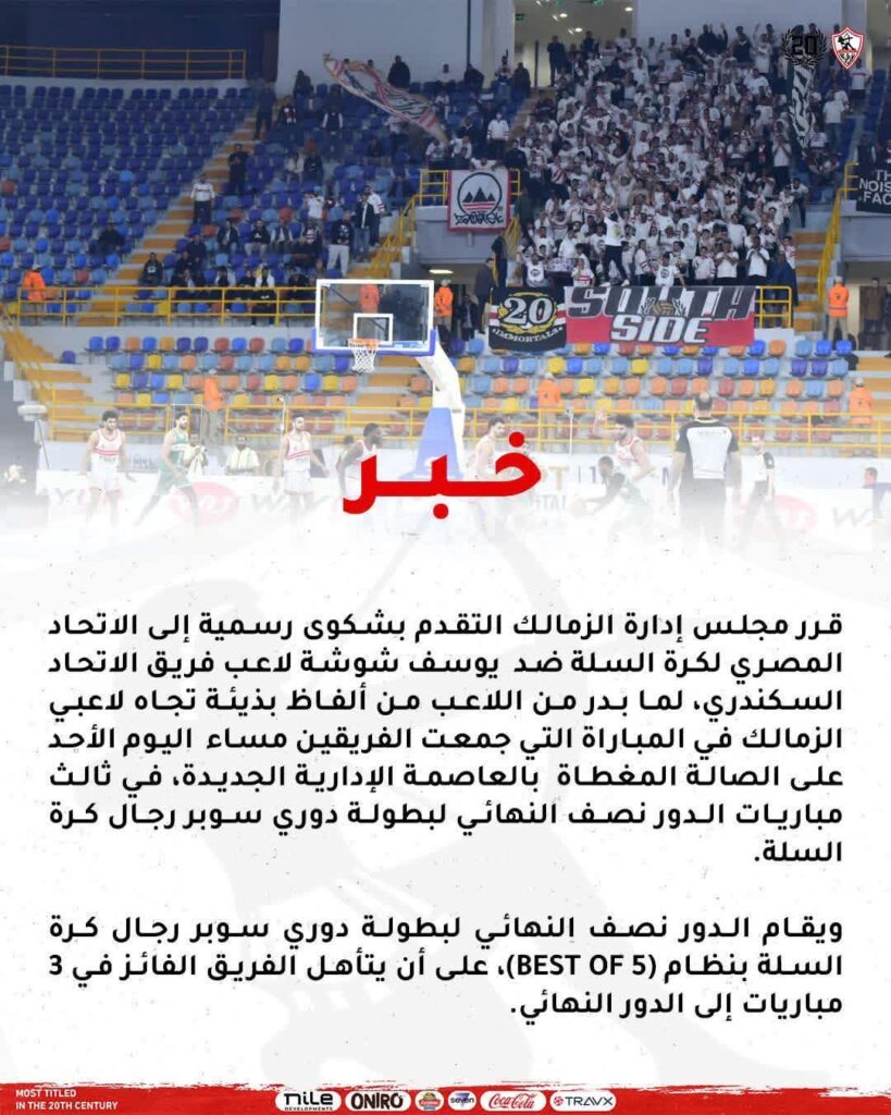 الزمالك يقرر تقديم شكوى رسمية ضد يوسف شوشة لاعب سلة الاتحاد