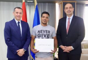 المهندس عمرو لاشين محافظ أسوان والدكتور عمرو عثمان مدير صندوق مكافحة الإدمان يسلمان مجموعة من المتعافين من تعاطي المواد المخدرة عقود لإنشاء مشروعات تجارية