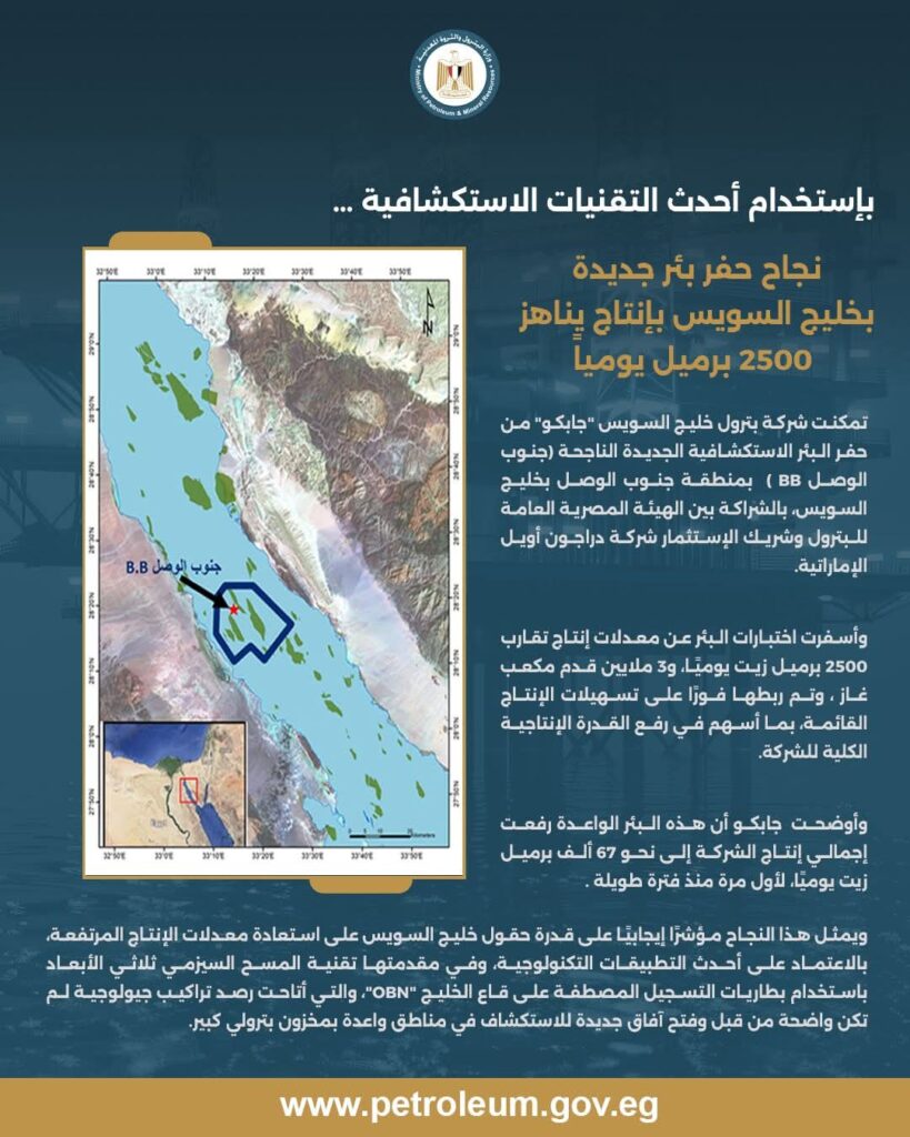 كتبت سحر مهني تمكنت شركة بترول خليج السويس “جابكو” من حفر البئر الاستكشافية الجديدة الناجحة ( جنوب الوصل BB ) بمنطقة جنوب الوصل بخليج السويس،…